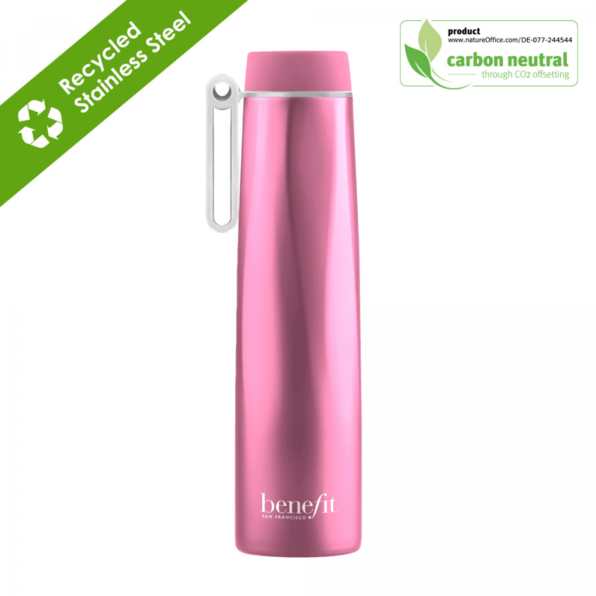 Keep hot beverages warm for up to 12 hours and cold for up to 24 hours. MADE TO FIT YOUR LIFE ! The ergonomic, rotating handle lets you quickly grab our Calypso bottle and go. Portable and perfect for a fast-moving lifestyle all year round, our chic and reusable Calypso Recycled Stainless Steel Bottle offers an environmentally conscious alternative to plastic bottles. Stainless steel is a highly sustainable material due to its recyclability. It has one of the highest recycling rates of any metal, with over 90% of it being recycled worldwide. This means that stainless steel can be melted down and reused in the production of new products, reducing the need for new mining and extraction of raw materials. Additionally, stainless steel's long-lasting durability, low maintenance requirements, energy efficiency, and versatility make it an environmentally friendly choice. Its use can help reduce waste, conserve resources, and minimize the carbon footprint of products and processes. It can't get more sustainable than that !