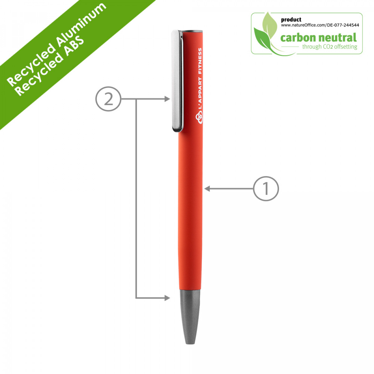 BND192 URRGH : fusion of elegance and eco-conscious design. Crafted with recycled aluminum and recycled ABS, this pen offers durability with a sleek, modern aesthetic. Unique to its design is the innovative push mechanism: simply press down on the clip to reveal the writing tip, combining ease of use with a sophisticated look. In line with chili's commitment to the environment, the BND192 URRGH is carbon-neutral, achieved through effective CO2 offsetting. Ideal for the eco-aware and style-savvy, this pen is a standout choice for those who value functionality, design, and sustainability in every detail. BND 191 is available as a ball pen or with a graphite tip.