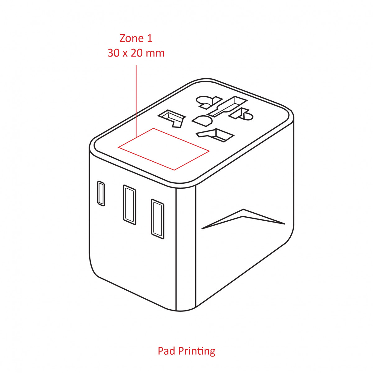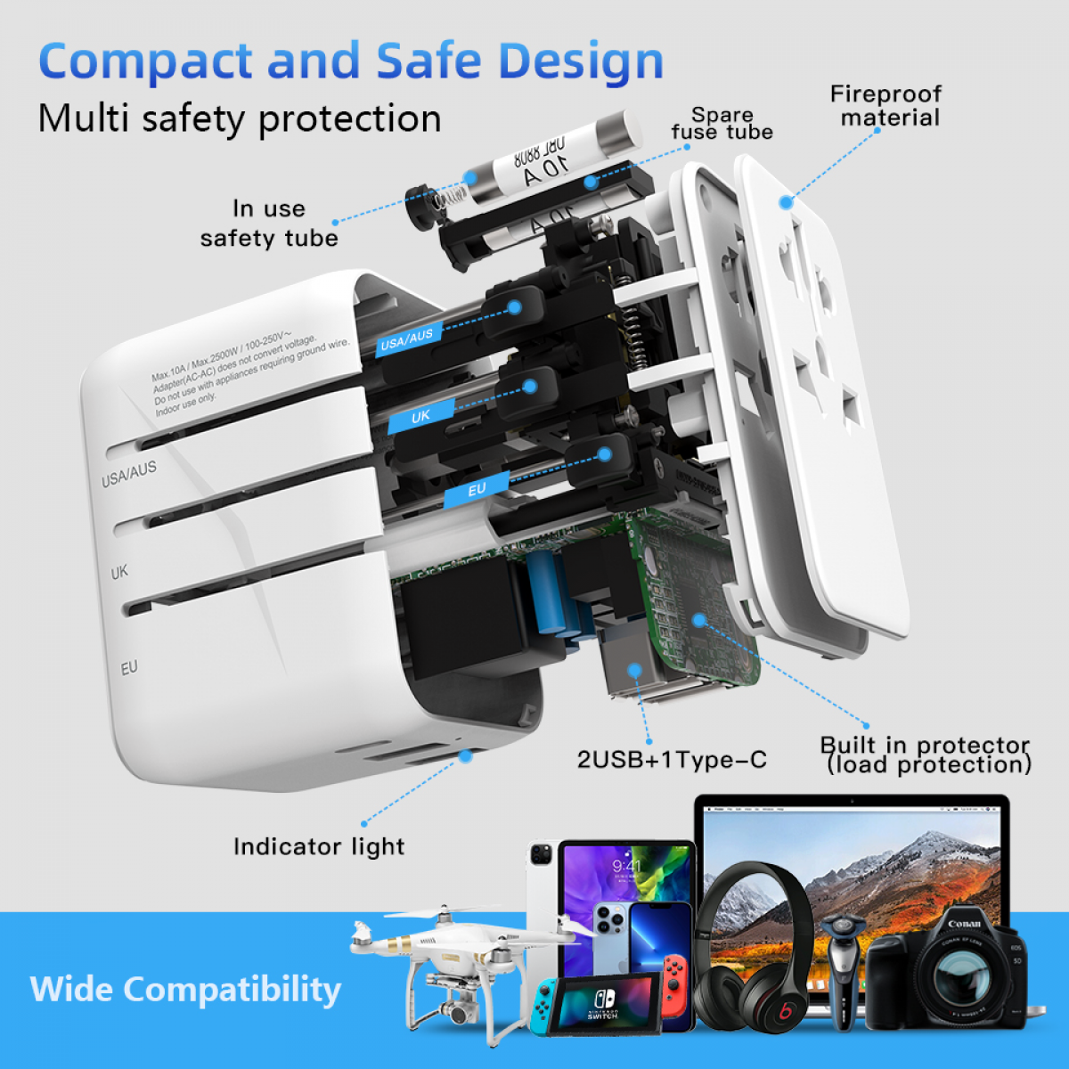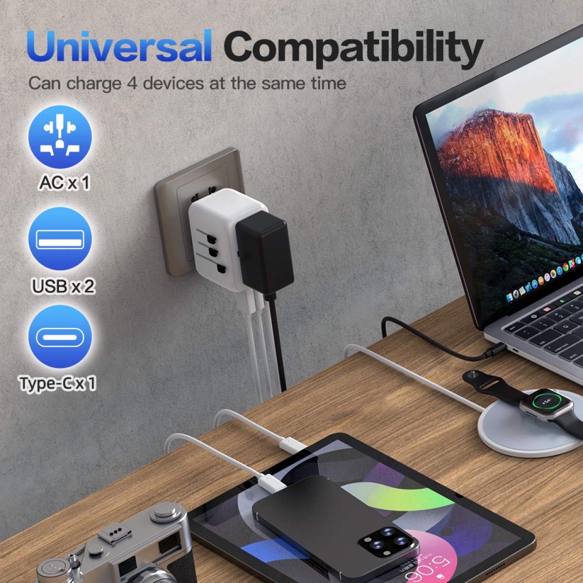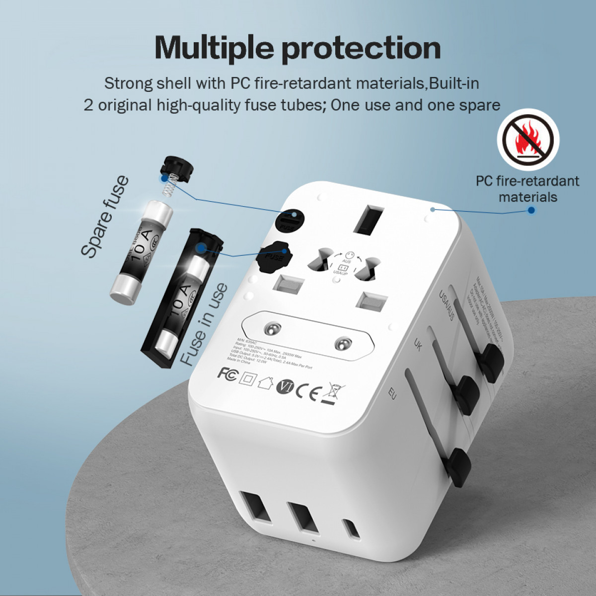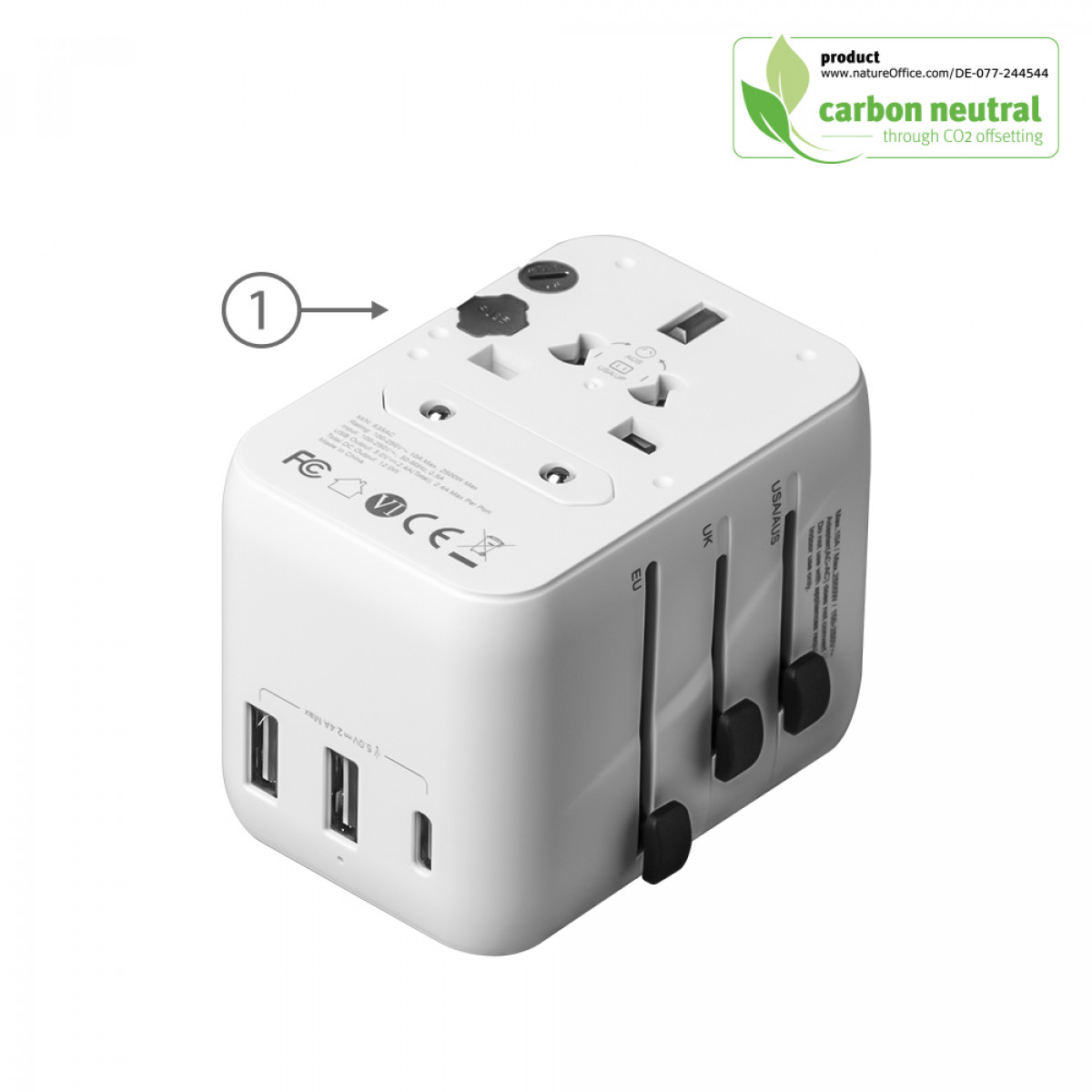 Suitable for 210 countries, 2 x USB A + 1 x USB C
