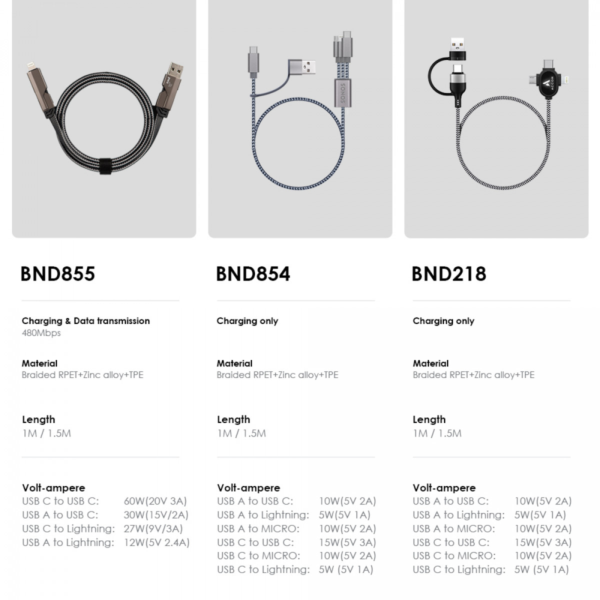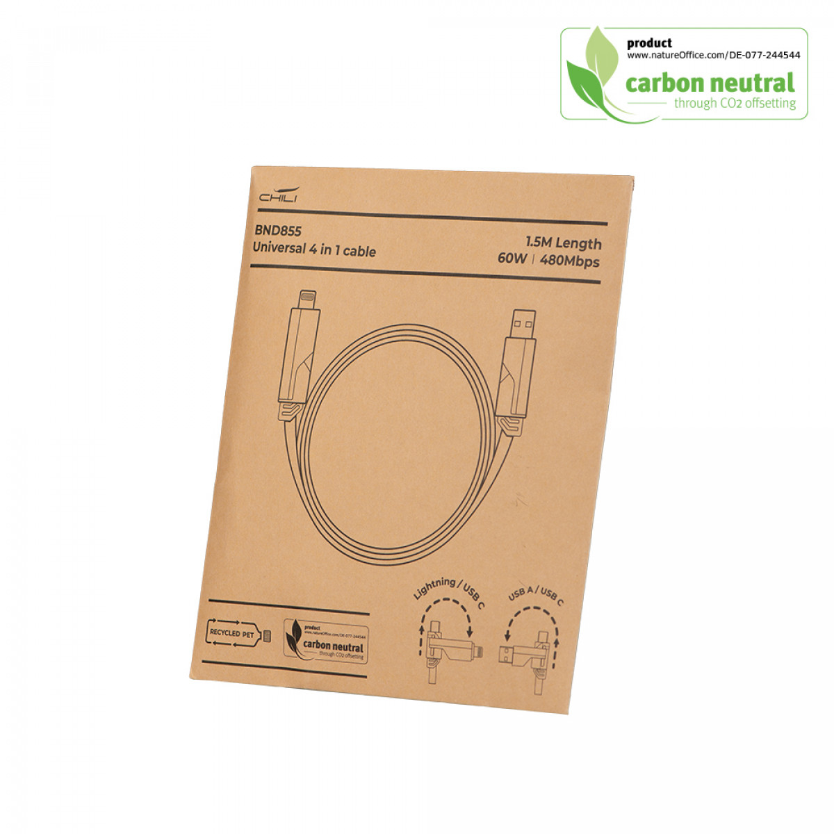 The BND855 Universal 4-in-1 Cable is your go-to charging solution for any device. Designed with sustainability in mind, it's made from recycled PET and offers four different connectors: Lightning/USB-C, and USB-A/USB-C. With up to 60W charging power, this cable ensures your devices stay powered up quickly and efficiently. Whether you need to charge your smartphone, tablet, or any other device, this cable is up to the task. Available in both 1m and 1.5m lengths, and with a 480Mbps data transmission rate, this cable combines performance with eco-conscious design. Detailed Output information: USB C to USB C: 60W (20V/3A)USB A to USB C: 30W (15V/2A)USB C to Lightening: 27W (9V/3A)USB A to Lightening: 12W (5V/2.4A)