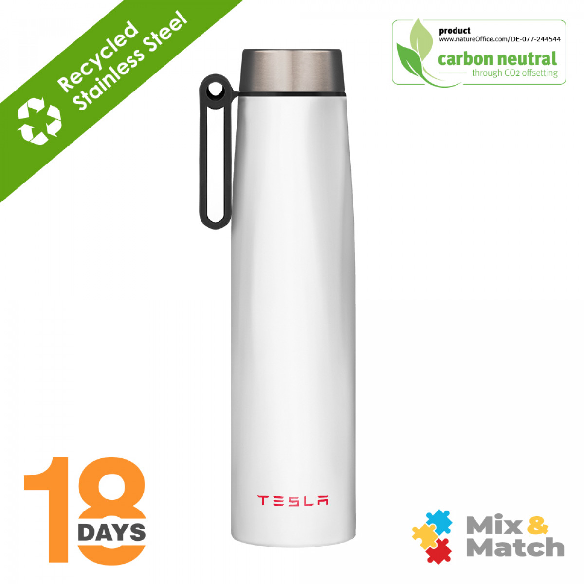 MADE TO FIT YOUR LIFE ! The ergonomic, rotating handle lets you quickly grab our Calypso bottle and go. Stainless steel is a highly sustainable material due to its recyclability. It has one of the highest recycling rates of any metal, with over 90% of it being recycled worldwide. This means that stainless steel can be melted down and reused in the production of new products, reducing the need for new mining and extraction of raw materials. Additionally, stainless steel's long-lasting durability, low maintenance requirements, energy efficiency, and versatility make it an environmentally friendly choice. Its use can help reduce waste, conserve resources, and minimize the carbon footprint of products and processes. It can't get more sustainable than that !