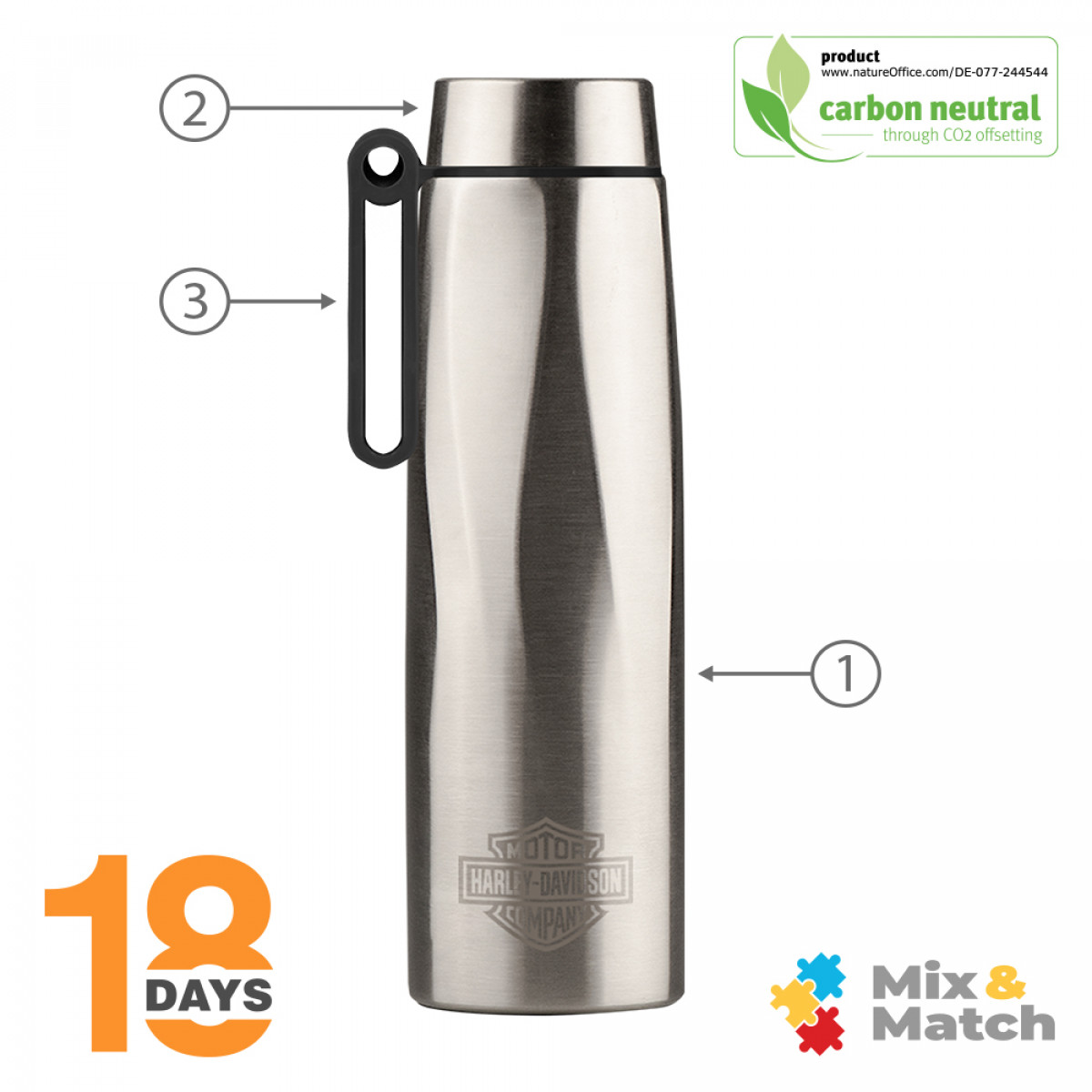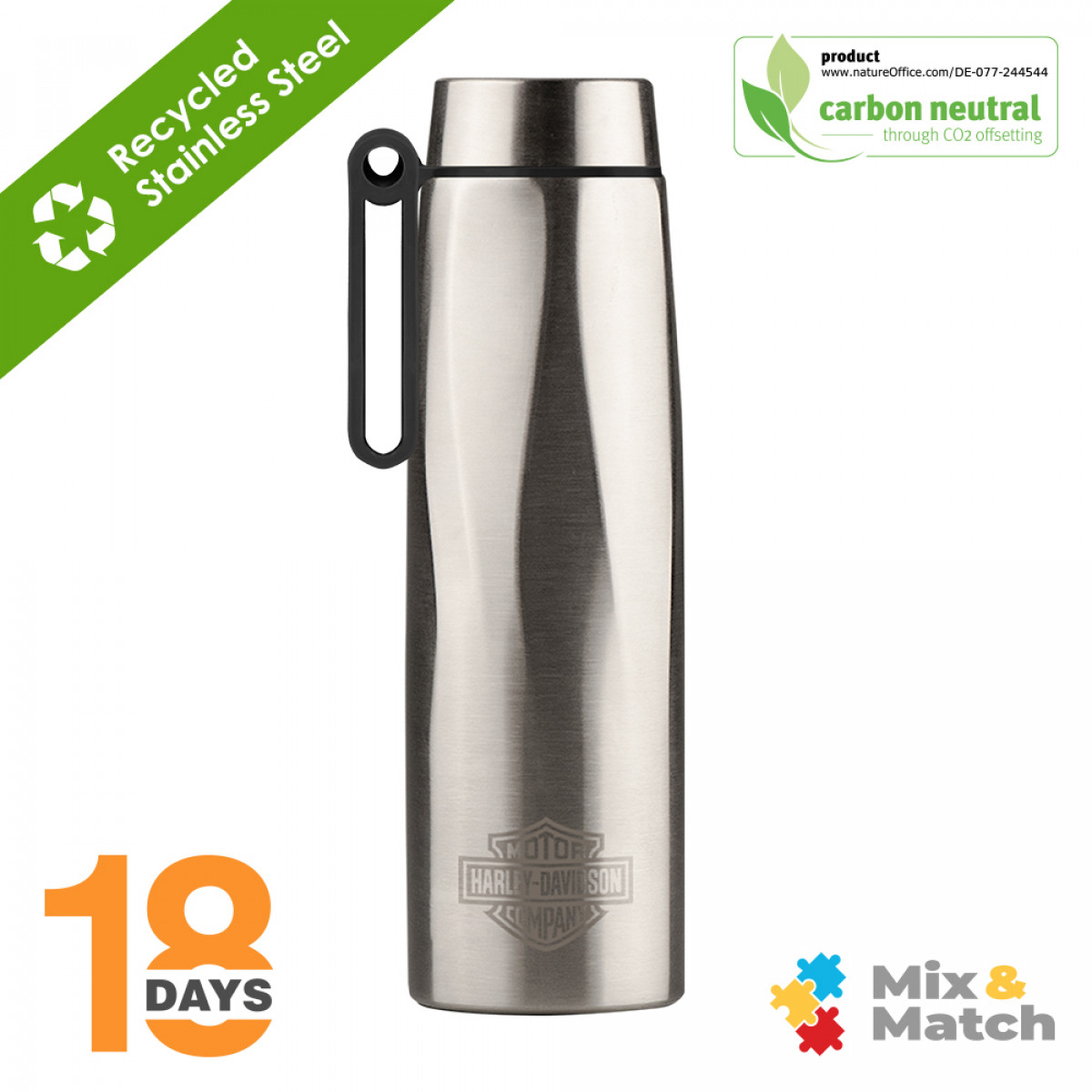 Keep hot beverages warm for up to 12 hours and cold for up to 24 hours. MADE TO FIT YOUR LIFE ! The ergonomic, rotating handle lets you quickly grab our Calypso bottle and go.Portable and perfect for a fast-moving lifestyle all year round, our chic and reusable Calypso Recycled Stainless Steel Bottle offers an environmentally conscious alternative to plastic bottles. Stainless steel is a highly sustainable material due to its recyclability. It has one of the highest recycling rates of any metal, with over 90% of it being recycled worldwide. This means that stainless steel can be melted down and reused in the production of new products, reducing the need for new mining and extraction of raw materials. Additionally, stainless steel's long-lasting durability, low maintenance requirements, energy efficiency, and versatility make it an environmentally friendly choice. Its use can help reduce waste, conserve resources, and minimize the carbon footprint of products and processes. It can't get more sustainable than that !