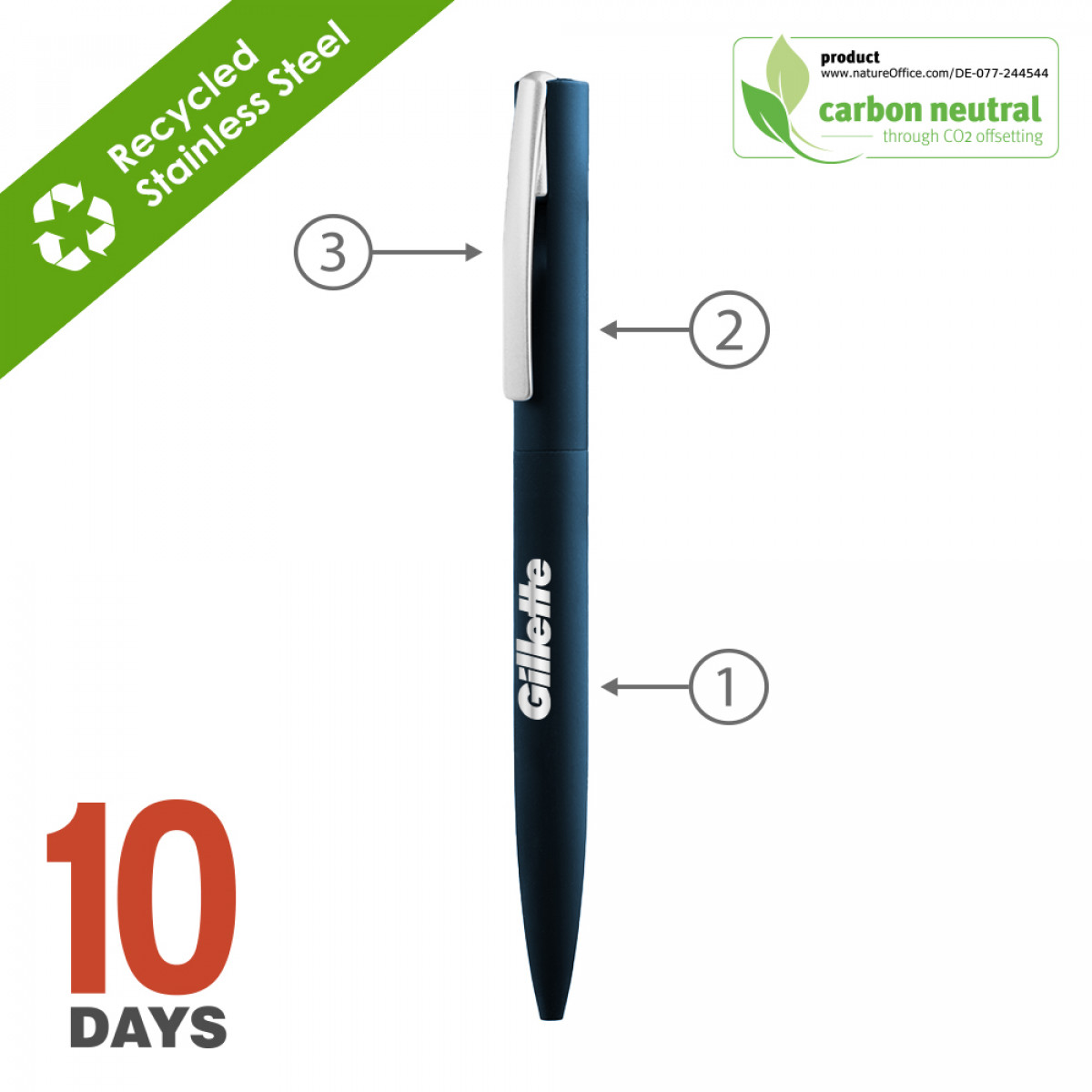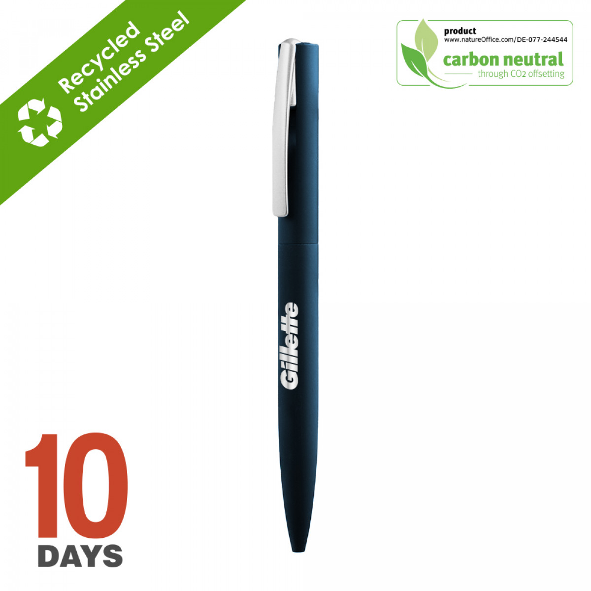 The BND182 LYD, Twist Metal Ball Pen is a sleek and stylish writing instrument that combines elegance and functionality. Its durable metal body provides a comfortable grip. Twisting the top will smoothly activate the mechanism, protecting the tip and keeping your pocket or bag neat. The pen writes smoothly and consistently, delivering crisp, clear lines every time. Whether you're taking notes, signing important documents, or jotting down a quick reminder, this pen is the perfect choice for anyone who values both style and performance. BND182 is made of recycled stainless steel. Stainless steel is a highly sustainable material due to its recyclability. It has one of the highest recycling rates of any metal, with over 90% of it being recycled worldwide. This means that stainless steel can be melted down and reused in the production of new products, reducing the need for new mining and extraction of raw materials. Additionally, stainless steel's long-lasting durability, low maintenance requirements, energy efficiency, and versatility make it an environmentally friendly choice. Its use can help reduce waste, conserve resources, and minimize the carbon footprint of products and processes.