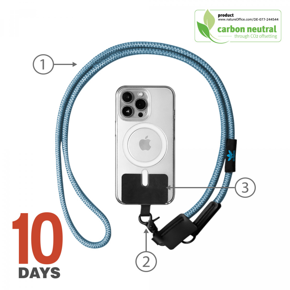 Made of RPET this innovative accessory is designed to keep your phone close and easily accessible. Thanks to its small adaptor, it can be attached to any phone case. Inspired by the ropes and lines used in the yatching and climbing world, its large section of cord ensures a comfortable fit. You want it shorter? Easy! Just tie a knot or 2! BND999 is a compatible shoulder strap of Chili crossover bags BND982, BND983 and BND985.