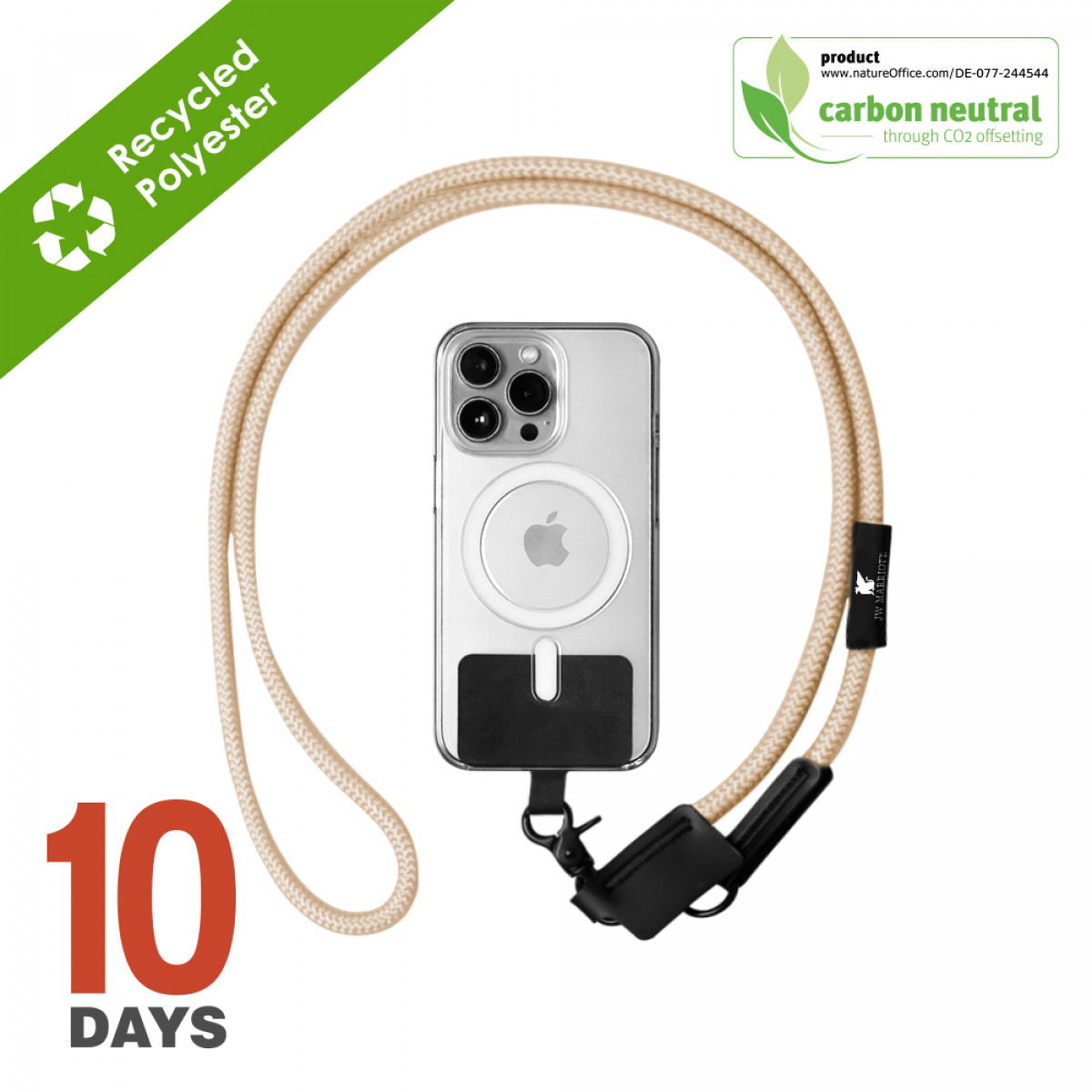 Made of RPET this innovative accessory is designed to keep your phone close and easily accessible. Thanks to its small adaptor, it can be attached to any phone case. Inspired by the ropes and lines used in the yatching and climbing world, its large section of cord ensures a comfortable fit. You want it shorter? Easy! Just tie a knot or 2! BND999 is a compatible shoulder strap of Chili crossover bags BND982, BND983 and BND985.