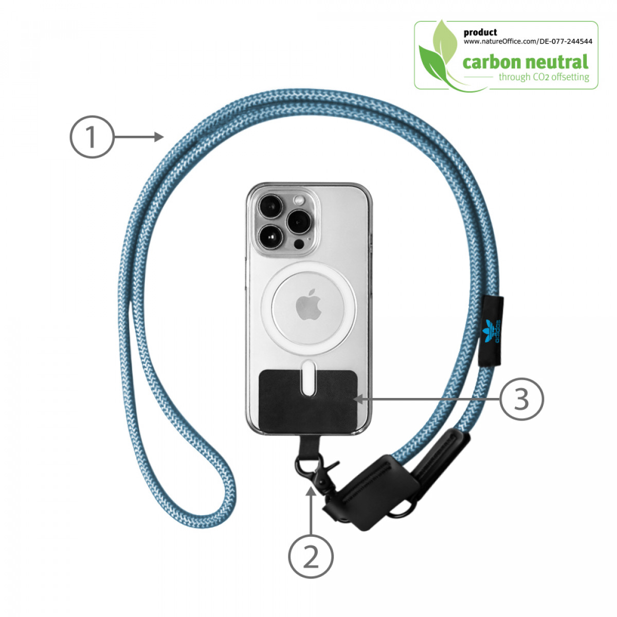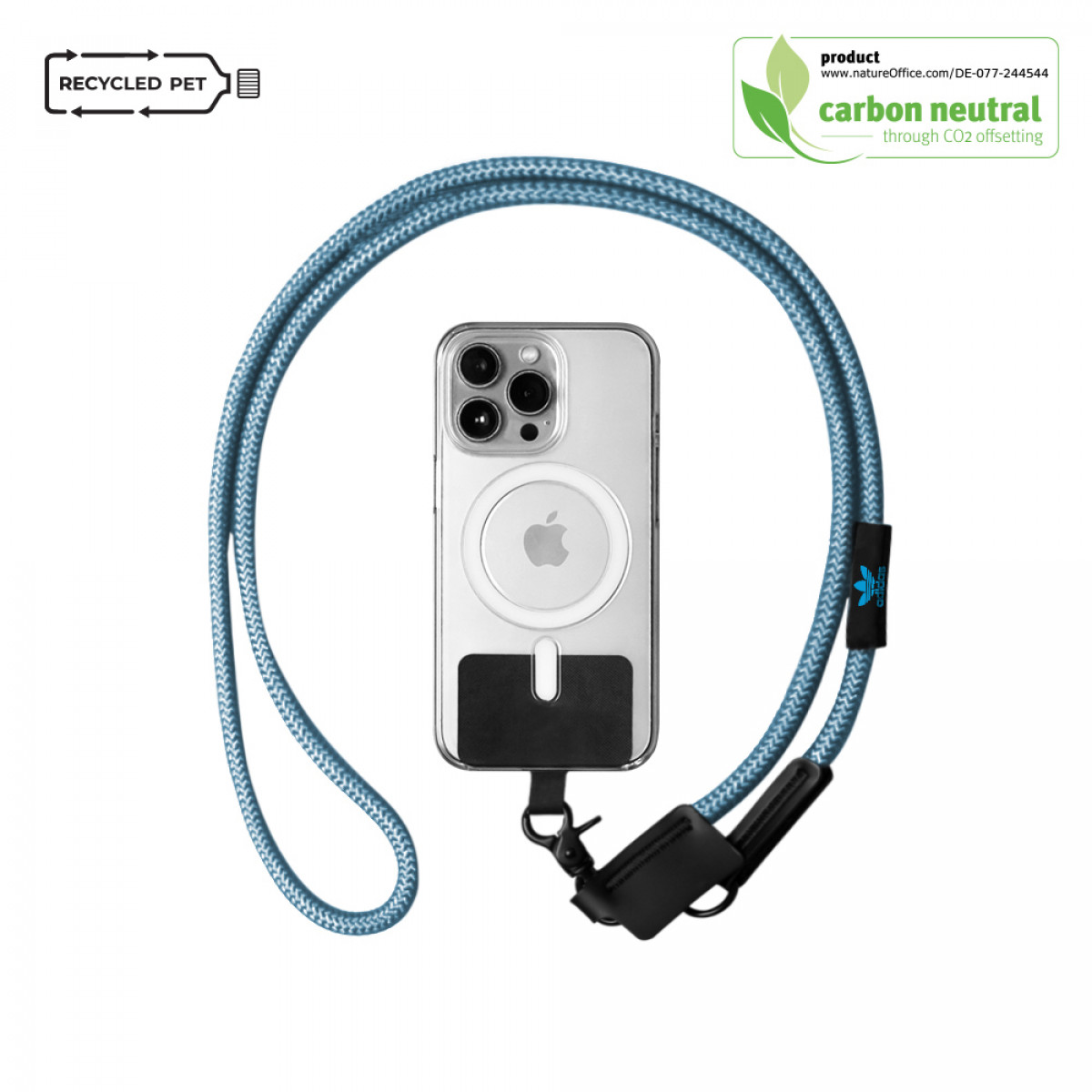 Made of Recycle Polyester, this innovative accessory is designed to keep your phone close and easily accessible. Thanks to its small adaptor, it can be attached to any phone case. Inspired by the ropes and lines used in the yatching and climbing world, its large section of cord ensures a comfortable fit. You want it shorter? Easy! Just tie a knot or 2!